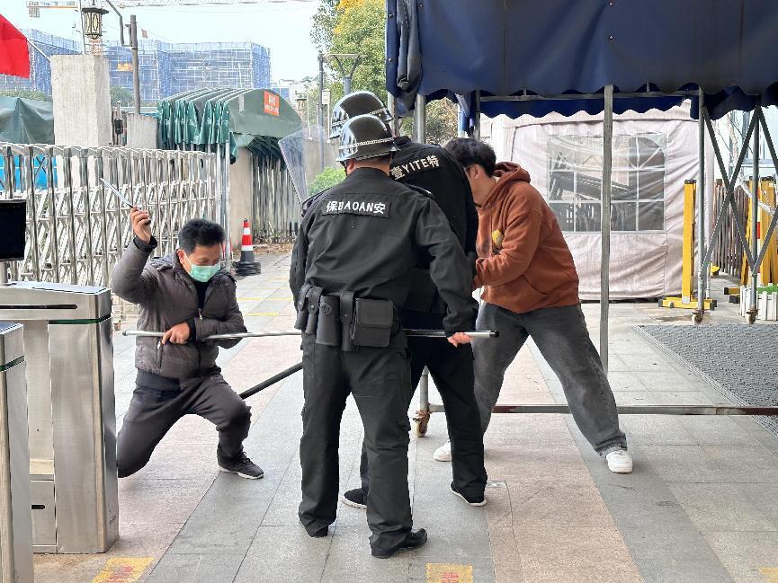 防暴小组人员快速到场,手持警棍、钢叉等迅速将施暴的“歹徒”团团围住,临危不乱,奋力抵抗暴力分子的行凶,保安与幼儿园防暴小组的联合行动下,“歹徒”被制服,至此警报解除。