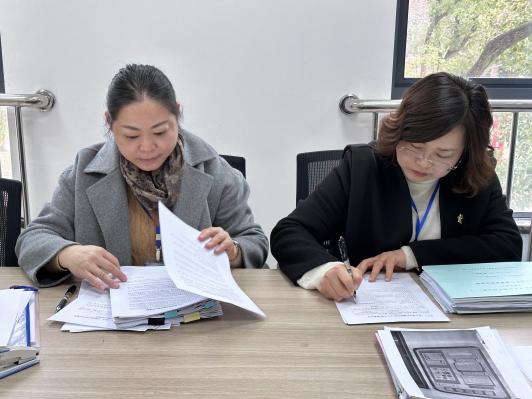 随后,徐园长向督导组详细说明了园内卫生保健、食堂管理和安全工作等具体情况。两位督学对照督查指标,全面细致地查看了相关台账资料。