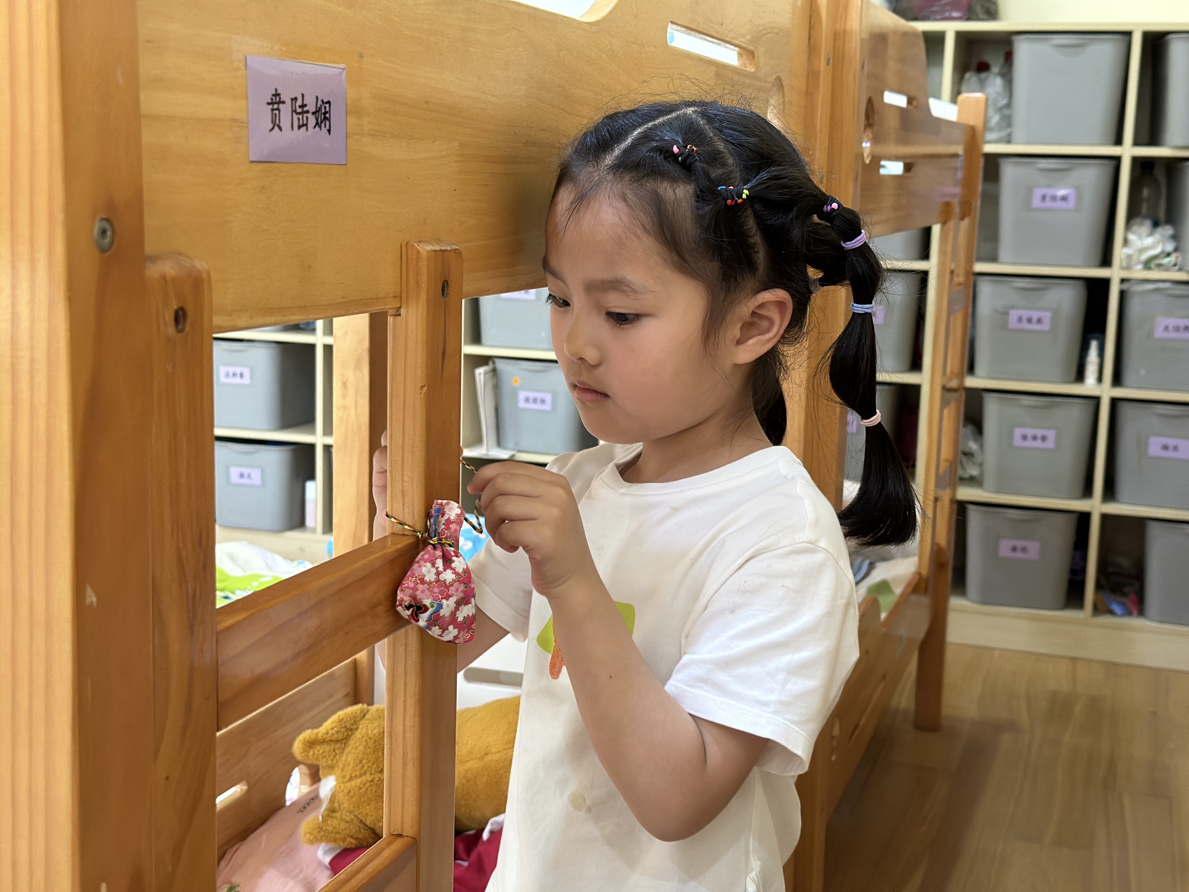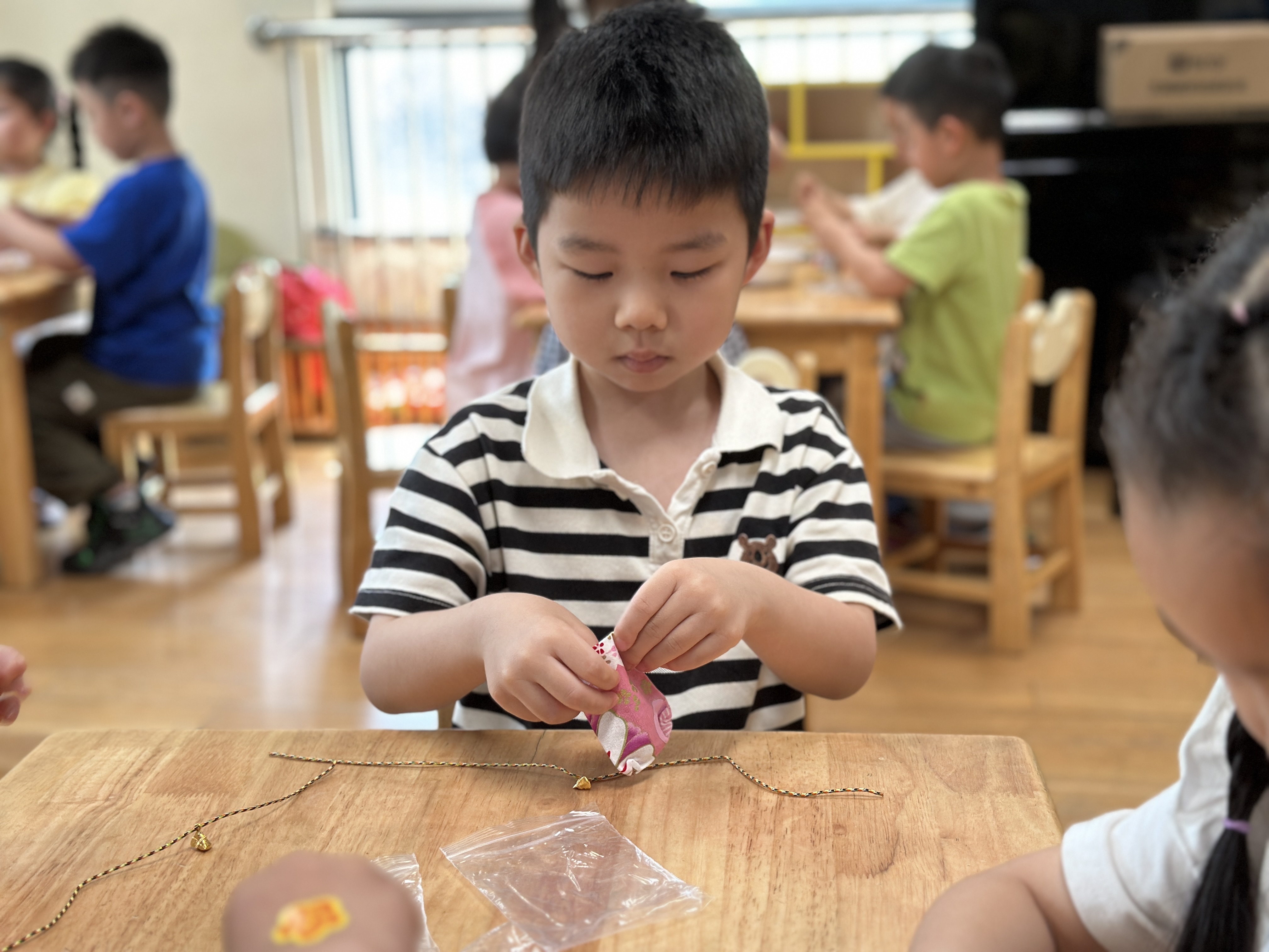 不一会儿,中一班的教室里已经充满了香包的气味,孩子们兴奋地说:“这样我一定不会被咬啦!可以过一个幸福的夏天~”“老师,我们还有多的香包吗?我想送给我隔壁班的好朋友,让她也开心一点,也让蚊子们不要飞进她们班。”说干就干,让我们一起把这一份香包祝福送给大家吧!