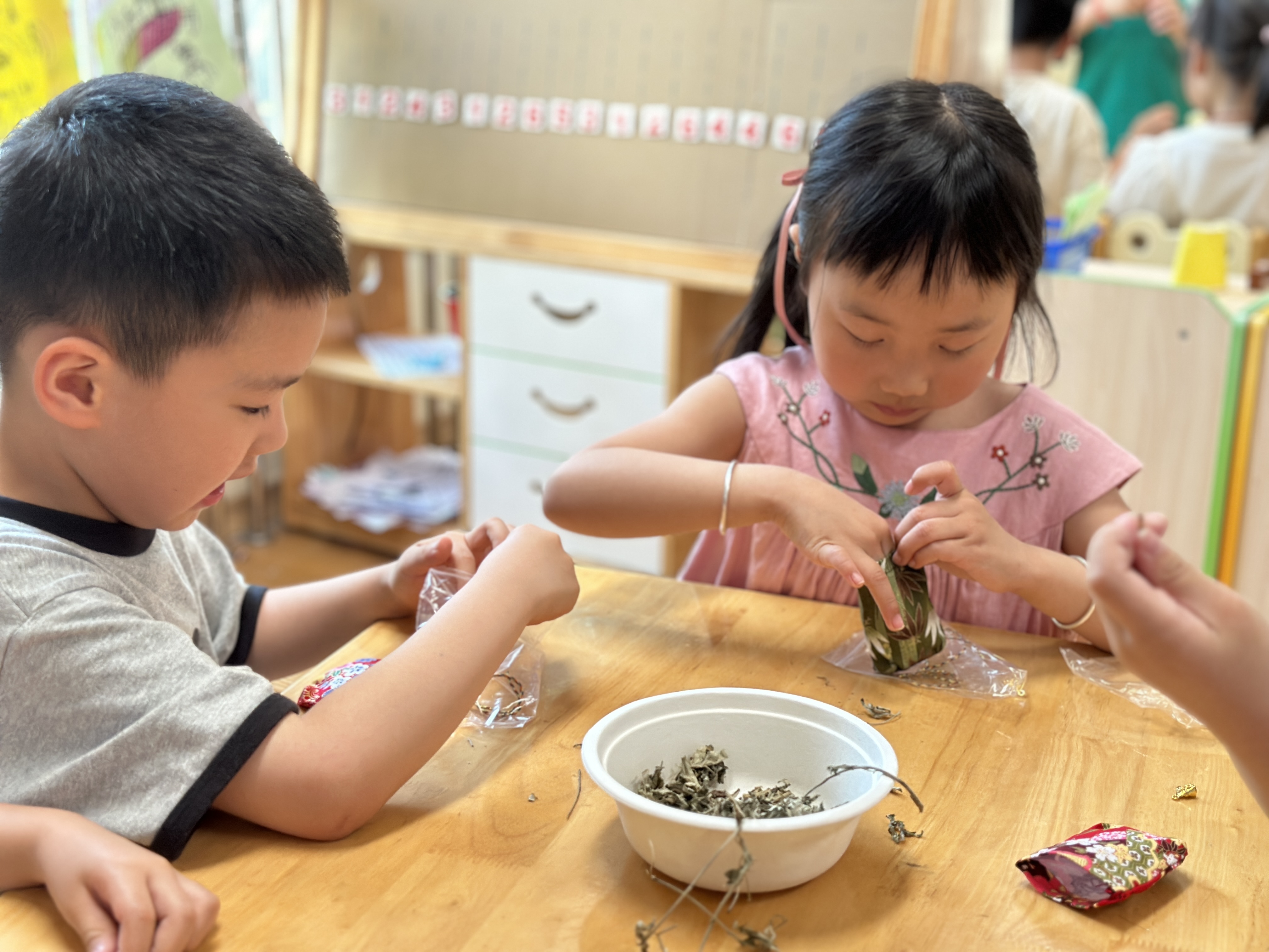 在了解了香包的秘密之后,孩子们就迫不及待地想自己试一试啦!通过前期对蚊虫的大调查,孩子们对驱蚊植物已经有了初步的了解,她们知道艾草、金银花、菖蒲等草药会发出特殊的香味,驱赶蚊虫。