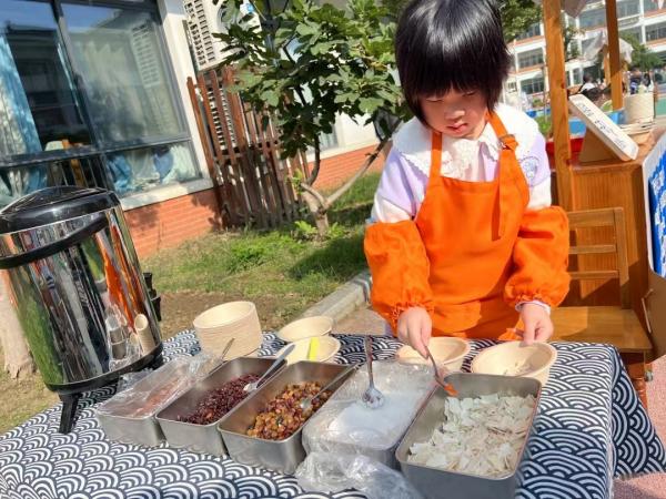 “运河大集今日促销,快来免费体验哦!”在热情的招待中,老师们一进入小镇便被迎接着赶起了大集。茶集里,一碗碗温暖香甜的饭糍干茶让客人满舌生津,心生熨帖;美食集里,一个个细腻香醇的糕饼让客人赞不绝口,心生享受;花集里,孩子们为客人捧上包装精美的茉莉花束,戴上精致的茉莉花手串,让客人心生惊喜;文化集里,孩子们将刚刚做好的运河文化冰箱贴、京剧脸谱拨浪鼓等纪念品大方赠与客人,更令人心感宾至如归。