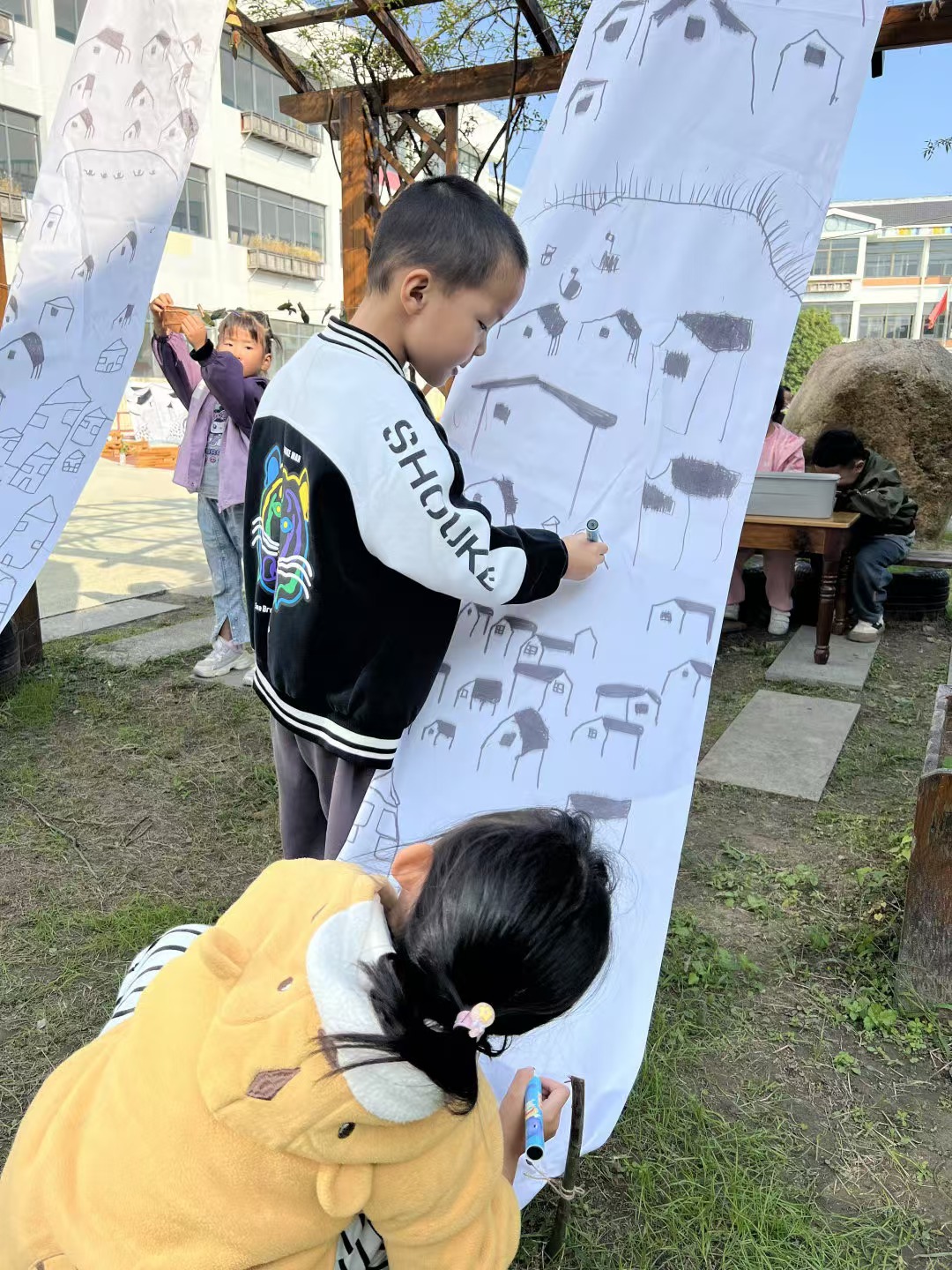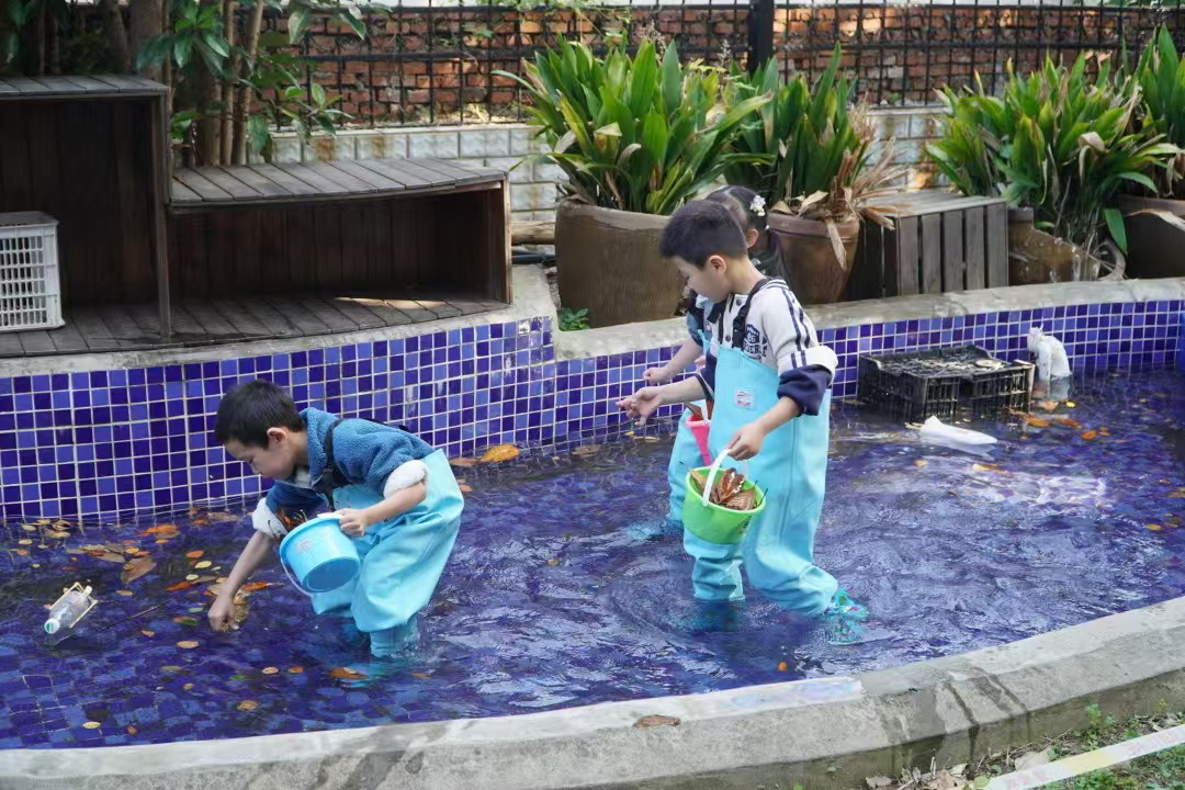 园内的小运河里,孩子们泛舟河上,时而打捞落叶、时而试航小船、时而自制风车……河中充满忙碌欢笑,岸边也不乏画意成趣。小画家们合作在长卷上吹出的十里运河景风韵十足……