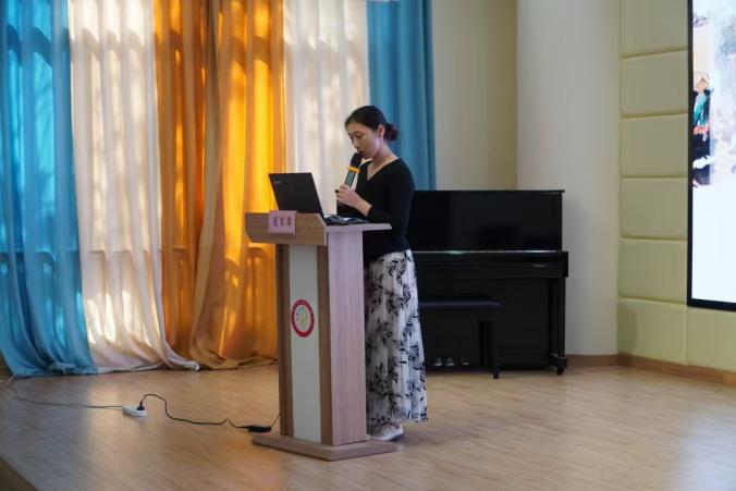 游戏观摩结束后,老师们齐聚报告厅、共展教研会。研讨活动由保教处沈国芳老师主持,教师代表吴翀燕老师介绍了坼幼运河文化特色的户外活动开展现况,并分享了幼儿园户外活动观察和分析的思与行。