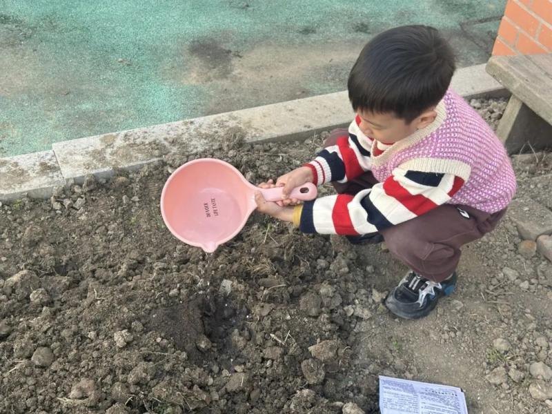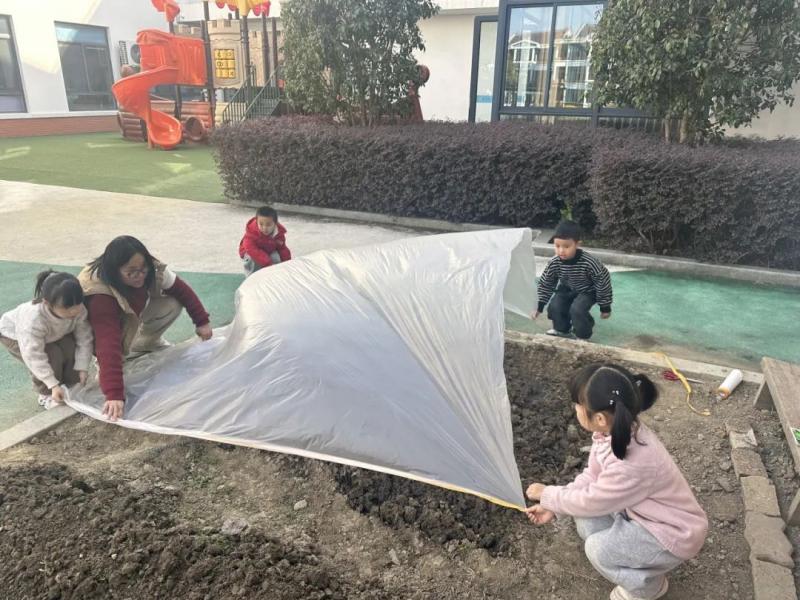 谷雨时节,最适合播种农作物,孩子们也在小菜地前忙碌起来,把西葫芦的种子种进泥土里,为它们铺上塑料膜,提高土壤温度促进种子萌芽。